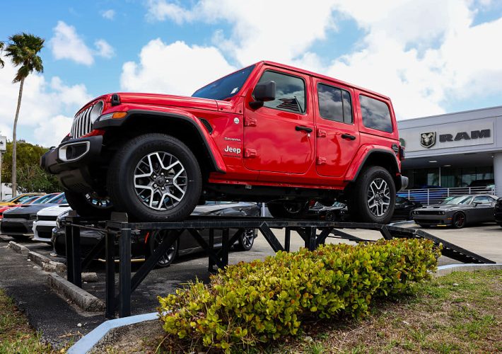 A new Jeep Wrangler 4-Door Sahara 4×4 vehicle displayed for sale at a Stellantis NV dealership in Miami, Florida, US, on Saturday, April 5, 2025. Eva...