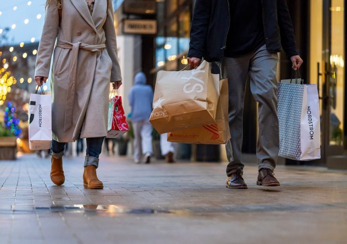 Shoppers carry Macy’s and Nordstrom bags at Broadway Plaza in Walnut Creek, California, US, on Monday, Dec. 16, 2024. The Bureau of Economic Analysis is scheduled...