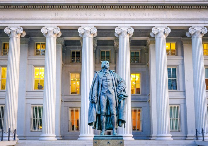 The statue of former Treasury Secretary Albert Gallatin stands in front of the north wing of the U.S. Treasury Department headquarters building on April 24, 2025,...