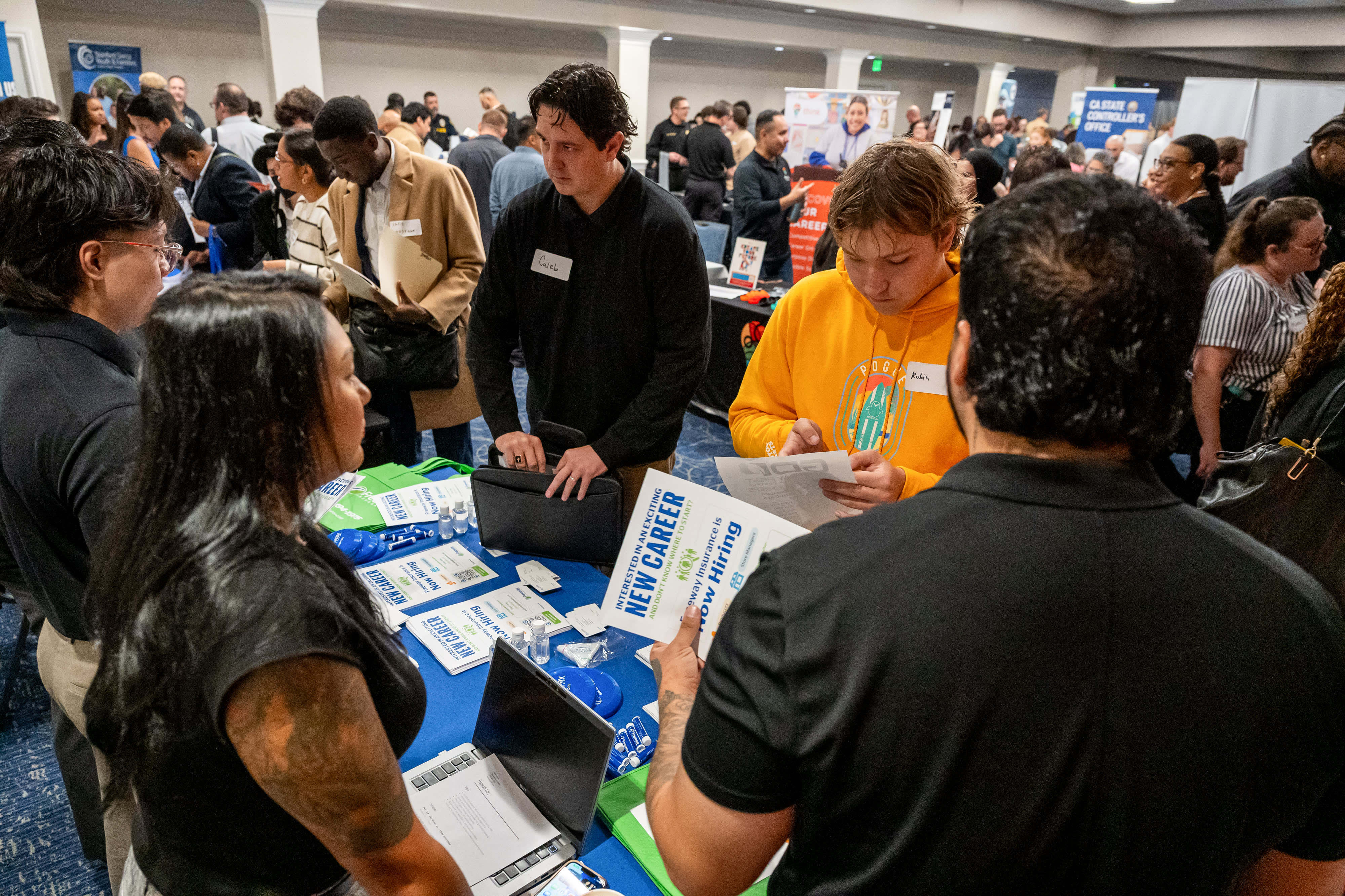 Job seekers speak with recruiters during the SacJobs Career job fair in Sacramento, California, US, on Thursday, Nov. 13, 2025.